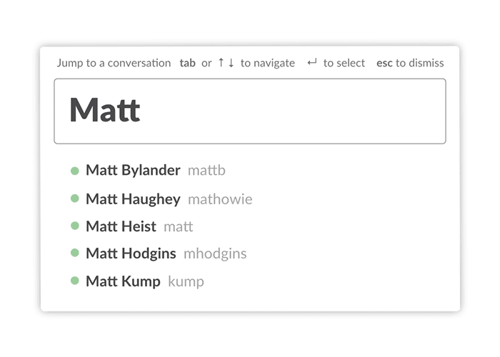 We also rebuilt the Quickswitcher to handle these cases far better. The Quickswitcher allowed keyboard users to type `cmd+k` and then the name of the channel or person they wanted. The first version of the navigation interface simply matched what you typed against channel and usernames, which worked fine on small teams. However, in larger companies it failed miserably, loading slowly and never remembering which Matt you meant.