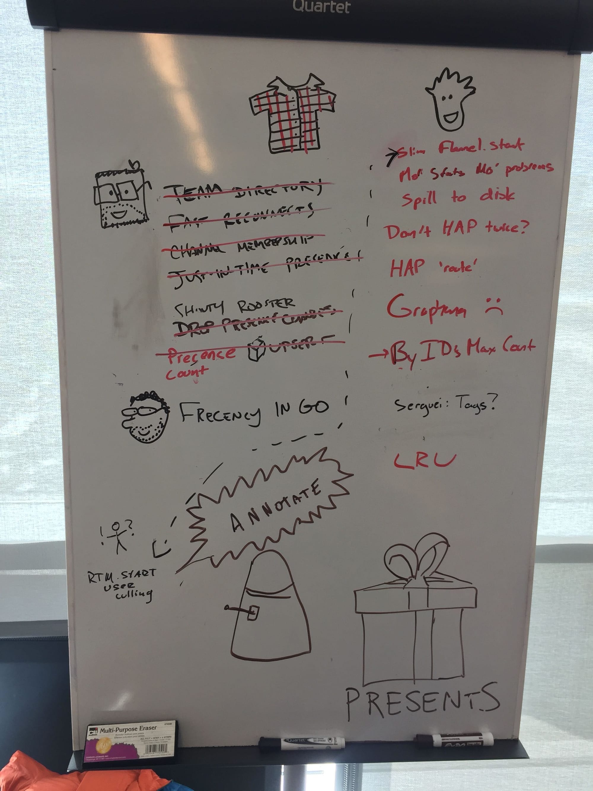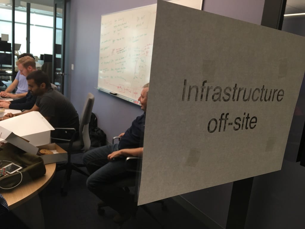 Left: Gathering to figure out how to fix everything that was broken. Photo Julia Grace. Right: A whiteboard in our IBM war room where we worked out some of the dozens of efforts that would go into growing the service to IBM-scale. Many represented months of work to be done.