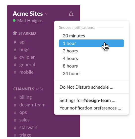 Do not Disturb options allow users to quickly quiet notifications for a predetermined amount of time or on a schedule. The “Shouty rooster” notifies a user before they broadcast a message using @channel.