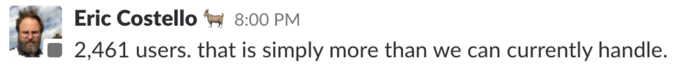 Despite our attention and scaling efforts, we began experiencing repeated outages. Slack would trend on Twitter due to the number of people frantically asking if the service was down. News outlets would post sarcastic articles about reestablishing face-to-face contact with your colleagues. We would put our heads down and scramble to get the service back online.