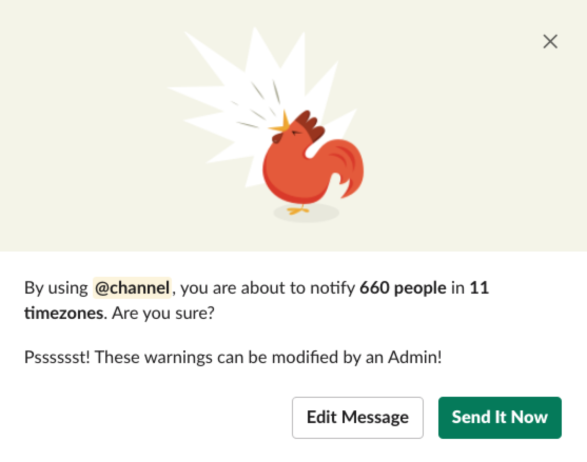 Additional problems cropped up as bigger teams began using (and abusing) all the ways Slack could send a notification. Do not Disturb let people shut Slack notifications off quickly when they need to focus or switch off from work. Custom Status gave others context about what someone was doing, so they could know if it was a good time to reach out. Shouty rooster gently let senders of @channel messages know how many people (across how many timezones) they would be notifying. After all, is it really that important? (Editors: “No.”)