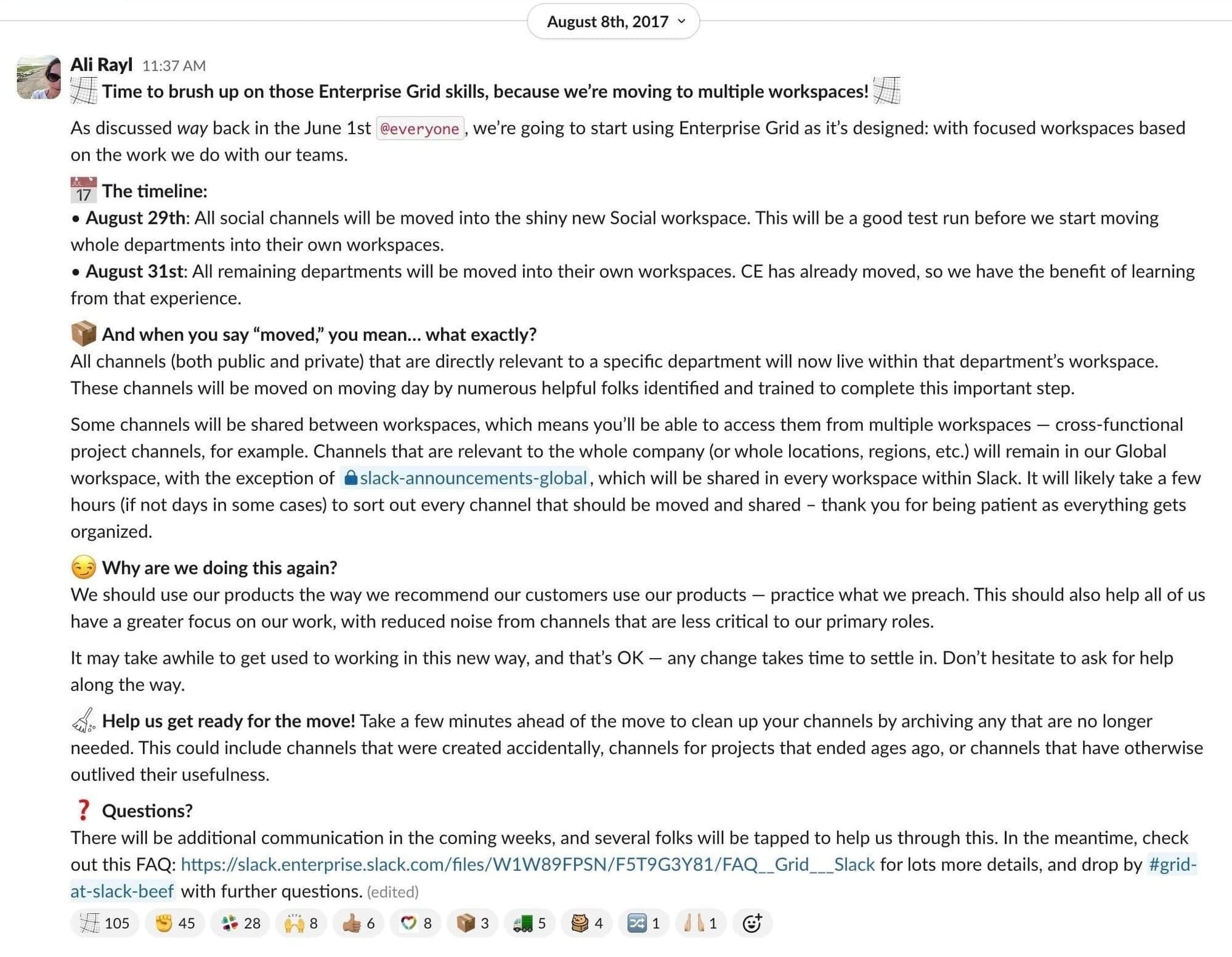 We set about preparing ourselves for the move. Before we could even get started we were faced with questions we hadn’t fully anticipated. We had to figure out how to divide up the company into workspaces. What channels belonged together? Who should have access? How should we manage that over time? Does it make more sense to divide up our work by department, project, region, or job description? We had channels that did all of these things, and when they were all in one big bucket that fluidity was natural.