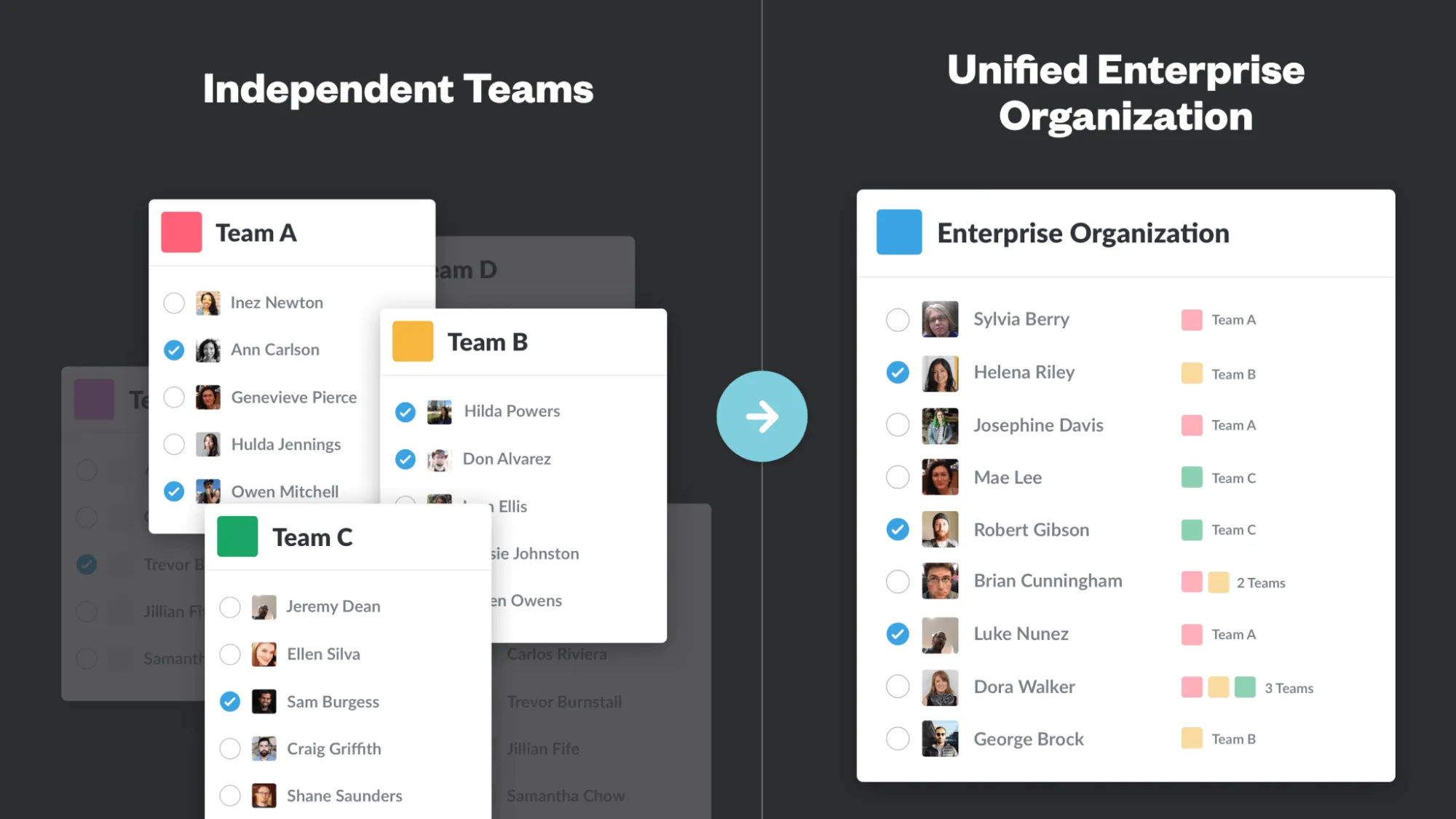 If a customer was starting fresh they could come up with something plausible and see how it evolved. But many customers were, like McKinsey, trying to graft an organizational map onto an existing Slack team with idiosyncratic patterns and organic relationships that had built up over time. Our Sales & Accounts people had heard about and relayed these challenges from many customers. Now we had to solve them for ourselves.