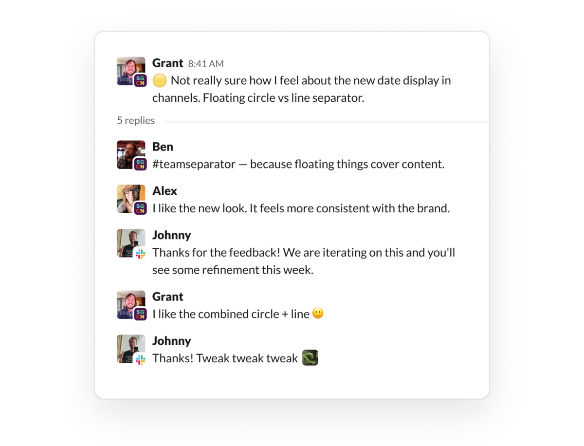 We gave this to a set of users from customer companies who joined us in our #slack-champions shared channel, where they could learn about the new designs and provide feedback. This gave us immediate information about whether people outside our building could understand what we were trying to do, and let them use it on their real teams with their actual messages. Our customers were thrilled to be brought into the process, and we got detailed feedback on everything from big layout changes to minor UI refinements.