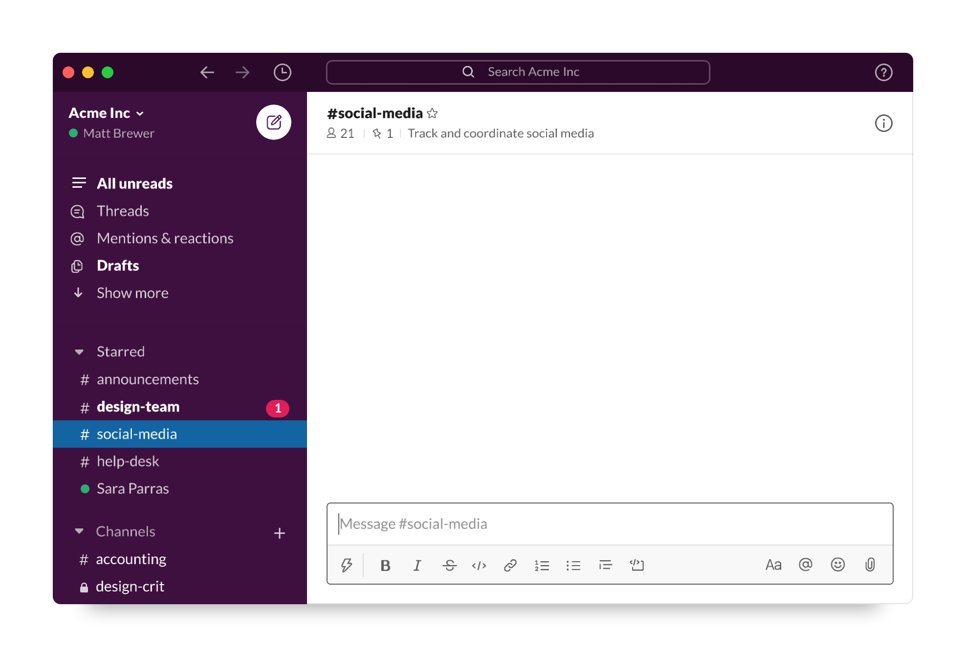Composer enabled standalone message composition (outside the context of a channel) and a list of unsent Drafts for review and editing. This matched many people’s expectations about what message composition should look like when switching from email to Slack.