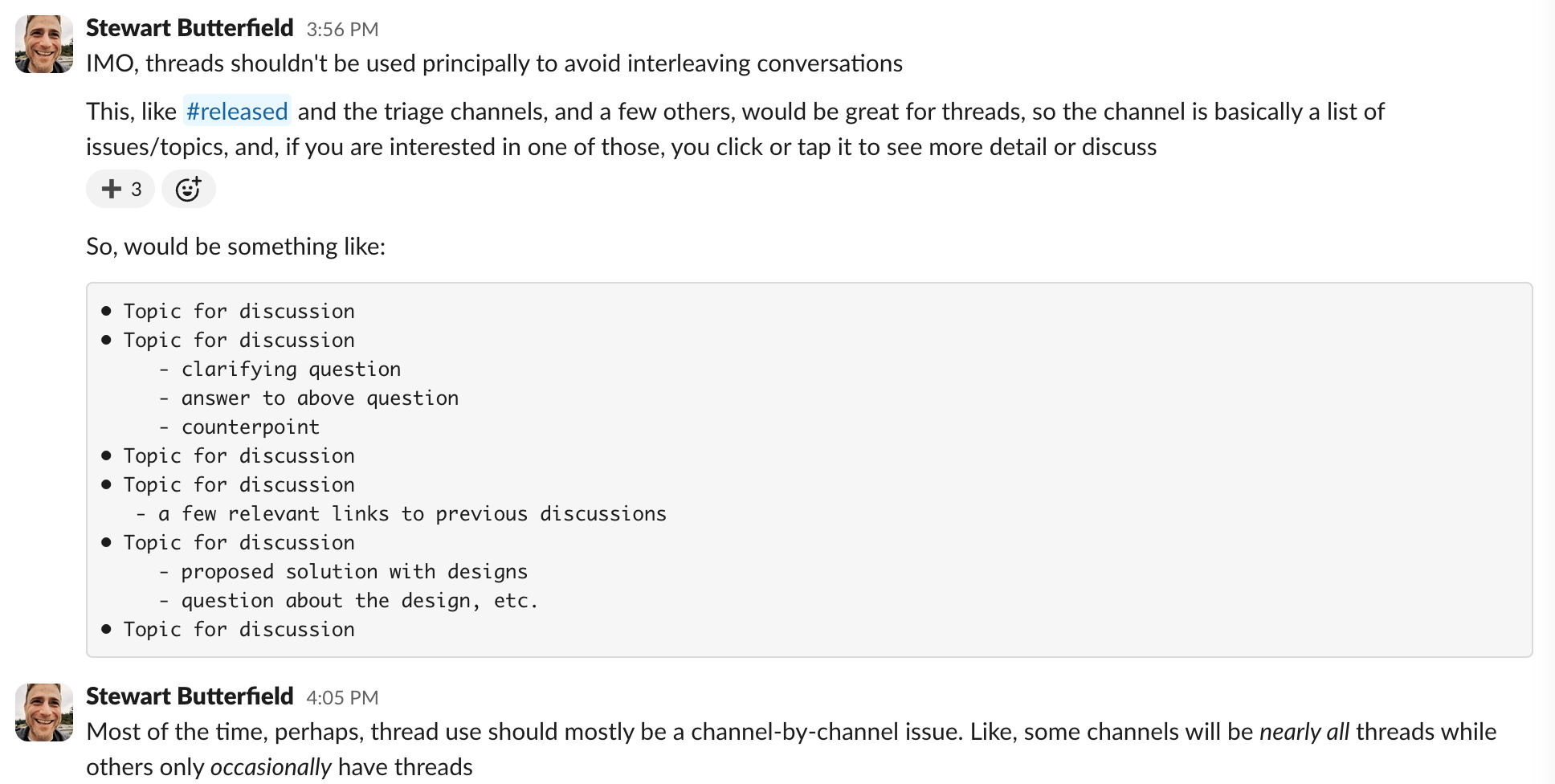 No concept was too big or interface detail too small to escape his consideration and comment. He would share a passionately argued essay on the chief requirements our clients (apps) should prioritize (#1: “Slack clients should be fast as fuck”). Or a long explanation of how he felt Threads should work as they were being internally tested. He would often share detailed examples from other products he felt we should emulate. Or more often just a screenshot of a UI bug and a big red arrow on it labeled: “WTF?!” (Mom, that means “What’s that for?”).