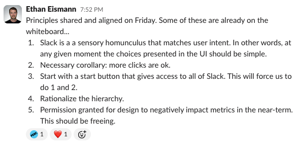 Stewart reiterated constantly that it was okay to ask the user to make more clicks if the choices they had were clear. He was adamant that a motivated user would figure out what Slack could do if we could reduce the decisions they needed to make up front.
