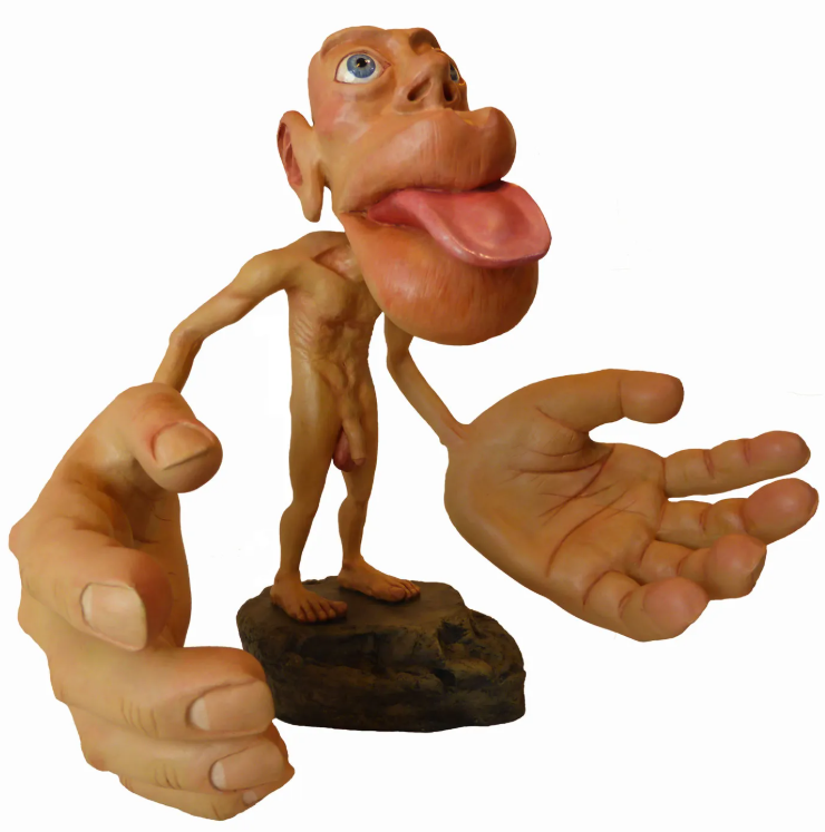 “Areas of the body with more complex and/or more numerous sensory or motor connections are represented as larger in the homunculus, while those with less complex and/or less numerous connections are represented as smaller. The resulting image is that of a distorted human body, with disproportionately huge hands, lips, and face.” Wikipedia