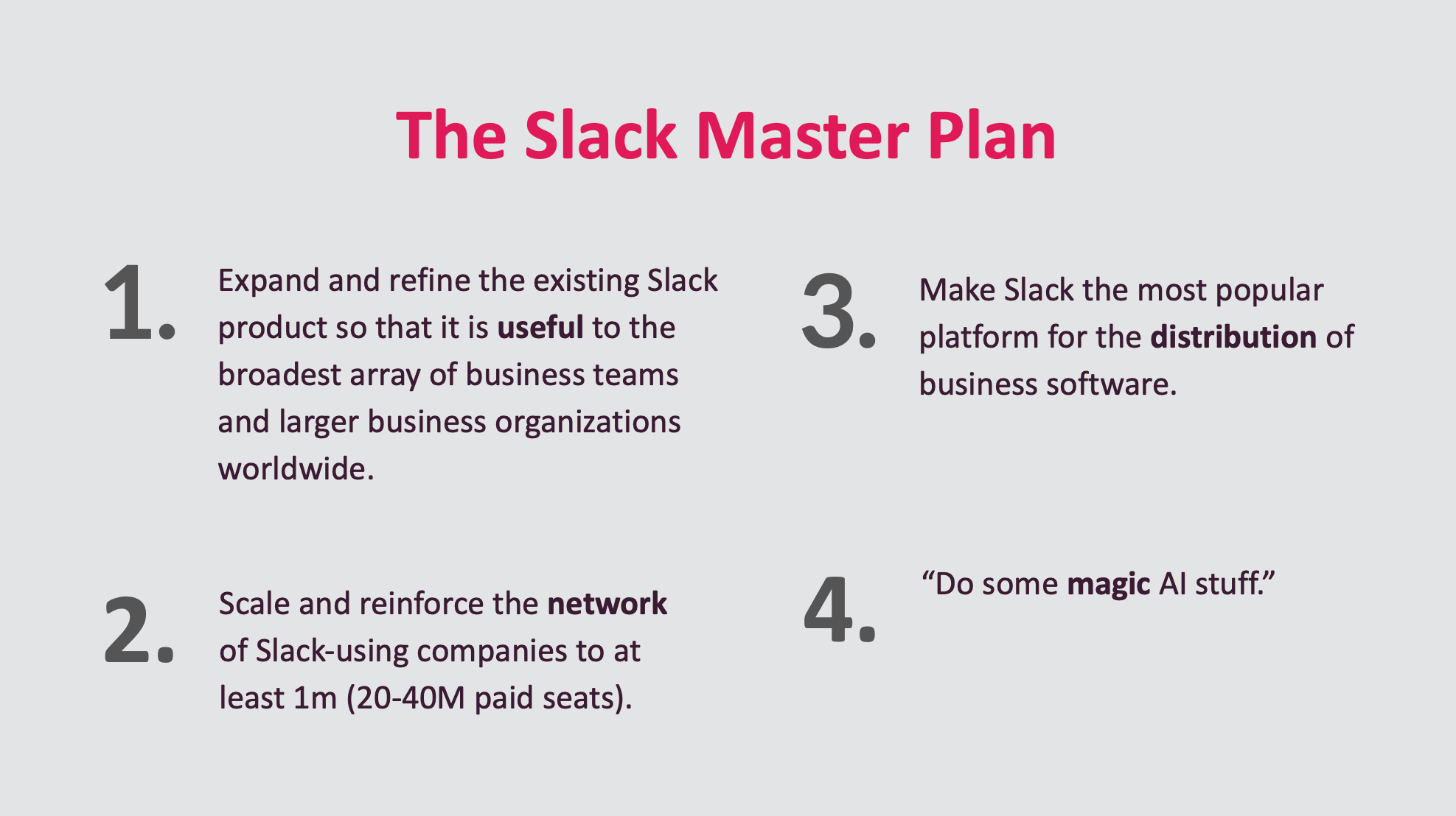 Taken together, Stewart proposed, these would cement Slack’s early lead. They would allow us to address the larger and more lucrative Enterprise software market, establish a moat through the network effects of Shared Channels and Platform integrations, and tap into emerging trends around AI-driven insights into company data.