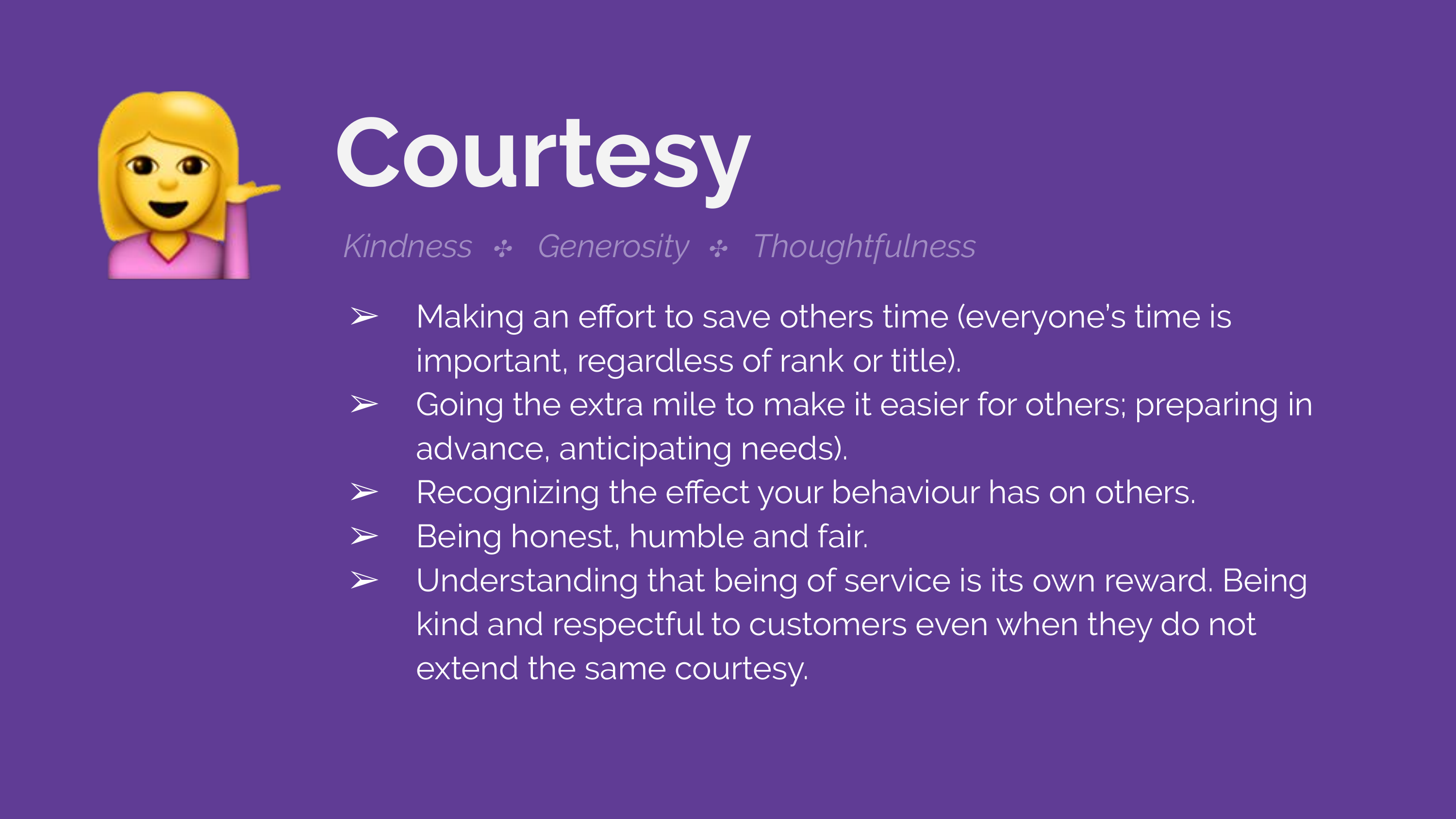 - Understanding that being of service is its own reward. Being kind and respectful to customers even when they do not extend the same courtesy.
