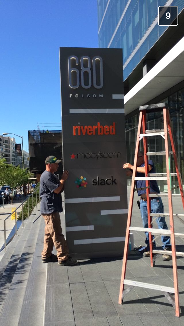 Getting our name on the sign at our first grown-up office in San Francisco on Folsom St. Milo Watanabe (Slack's first engineering intern) reclining at a freshly built desk.